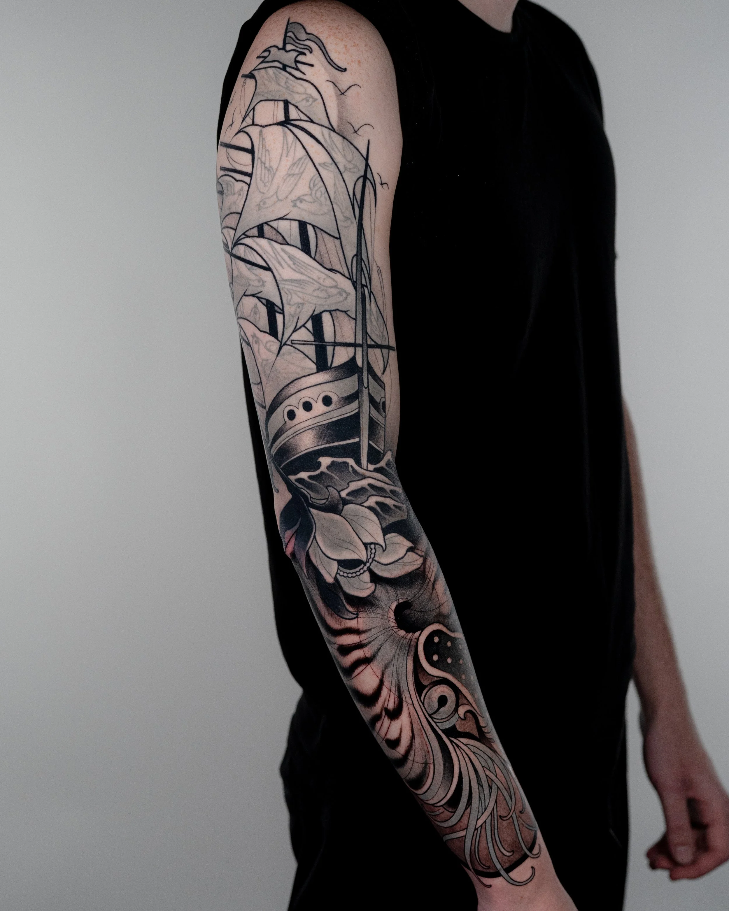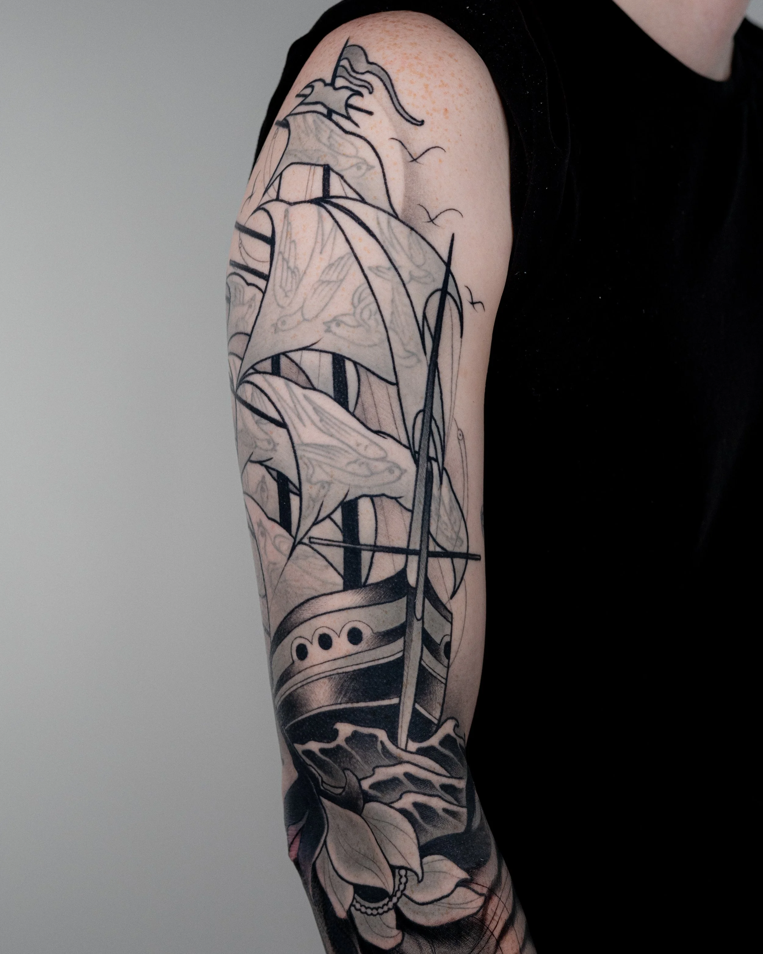 Explore how Gian Karle Designs for his Neo-traditional Tattoos both in Black & Grey and Color. “Gian emphasizes the importance of composition as the backbone of every successful tattoo.