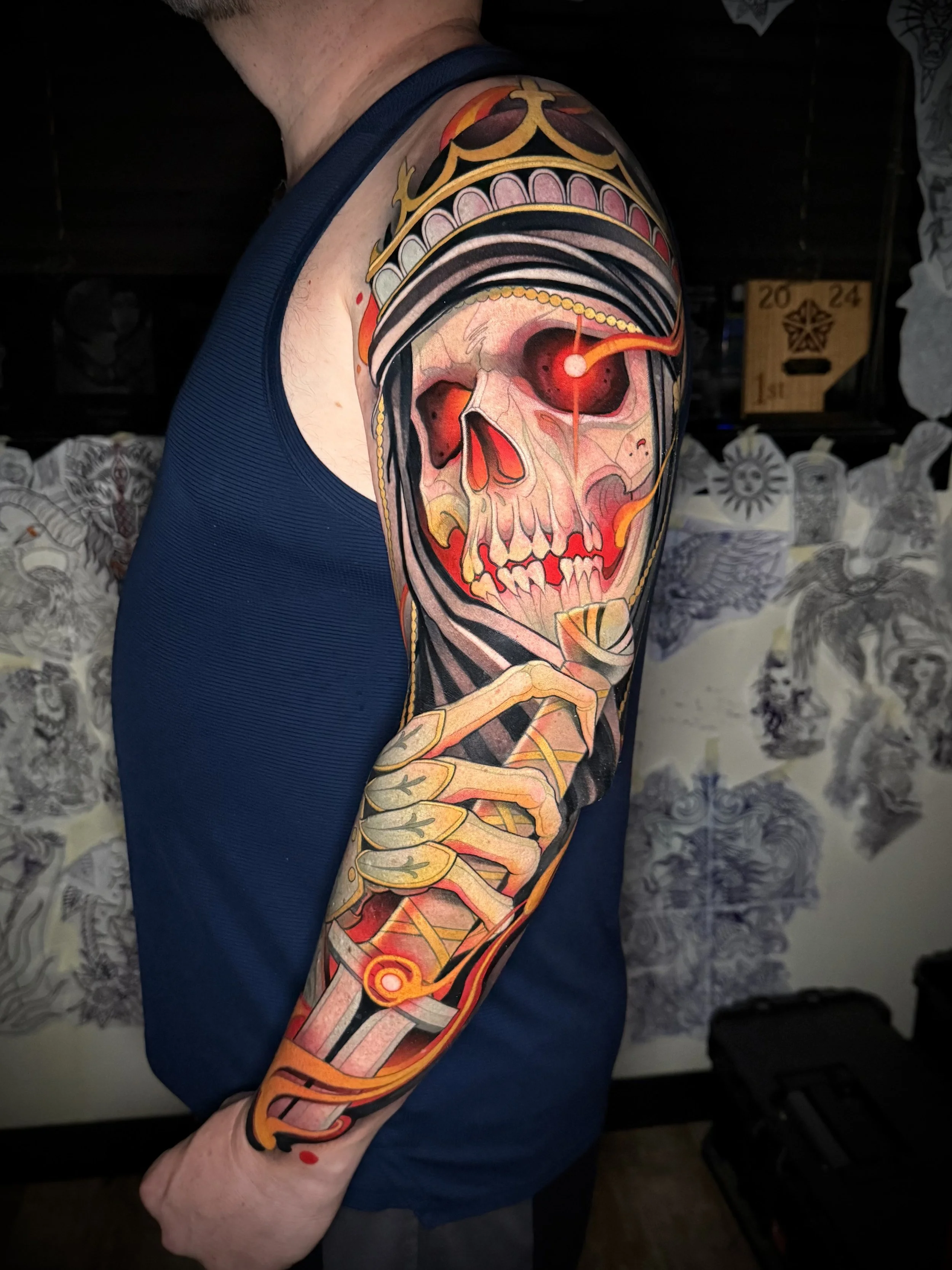 Black & Grey Tattoos can often be more challenging than working with color, especially in Neo-traditional designs where bold contrast & depth are crucial. Unlike color tattoos that offer a wide range of color temperatures to create contrast, Black & Grey relies on gradients and negative space to achieve dimension and impact. Gian uses Opaque greys to add another tone to his Black and Grey Tattoos.